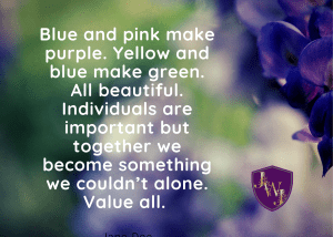 > Karah posted: ” Random thoughts that just flowed this morning. Blue and > pink make purple. Yellow and blue make green. All beautiful. Individuals > are important but together we become something we couldn’t alone. Value > all. Can our society please get back t” >